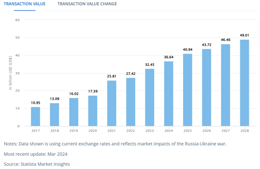 According to Thailand Market Research, The Digital Commerce market in Thailand is projected to achieve a transaction value of US$36.64 billion in 2024. With an annual growth rate (CAGR 2024-2028) of 7.54%, the market is expected to reach US$49.01 billion by 2028. By then, the number of users is anticipated to rise to 43.62 million, with an average transaction value per user expected to be US$1.10k in 2024. Comparatively, the highest transaction value globally is projected in the United States at US$2,255.00 billion in 2024.