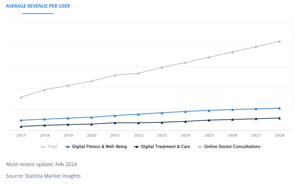 The average revenue per user (ARPU) is anticipated to be US$38.92. Within Malaysia, the Digital Fitness & Well-Being segment stands out, projected to generate US$242.30 million in 2024. The increasing demand for telemedicine and virtual healthcare services is a significant driver of this growth. This shift to digital health solutions in Malaysia is driven by convenience, accessibility, and personalized care. Young Malaysians are particularly inclined towards digital fitness apps for health tracking and maintaining active lifestyles. Urban professionals are turning to online doctor consultations for quick and hassle-free medical advice. Additionally, the digital treatment and care segment is seeing increased interest as patients prefer remote monitoring and virtual healthcare services.